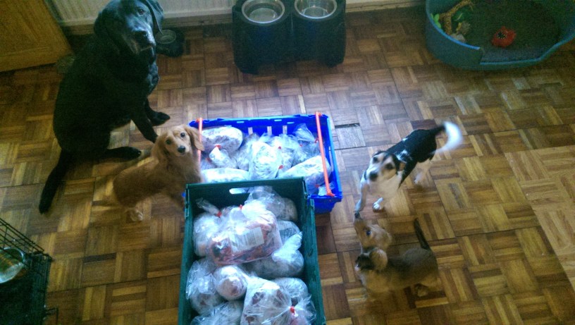 She has a list of percentages. Raw feeding, you understand, is not a simple case of meat, meat and more meat. Of course, there is meat, but it must be balanced with offal and bone. Aimée makes little gobbets of vegetable and herb, to improve the breath. She sprinkles parsley like a fancy-pants restaurant garnish.