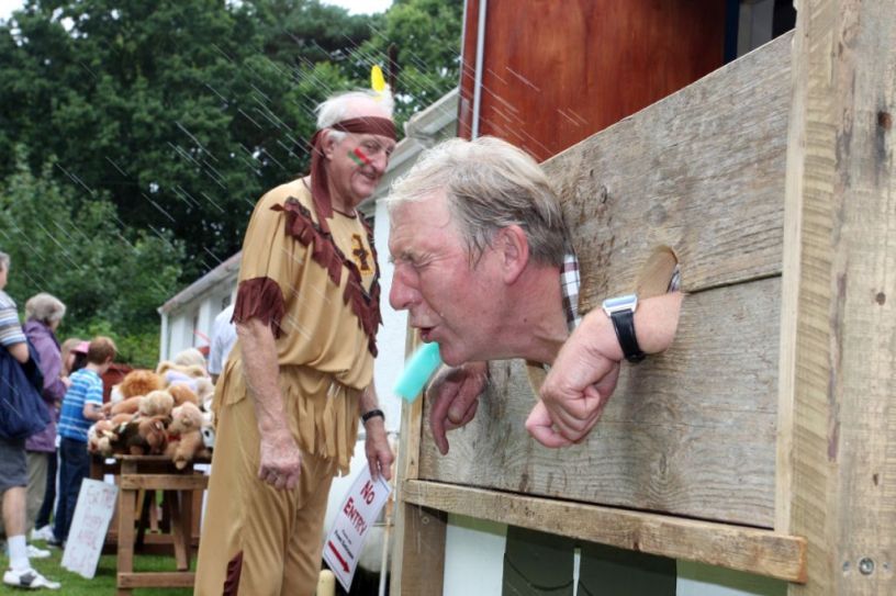 Once prone, they are locked in place, and people pay an amount (50p or similar) to throw wet sponges at them.