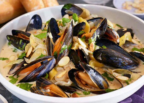- Stir the crème fraiche into the mussel cooking liquid in the pan and season with black pepper. Pour the liquid over the mussels. Serve with fresh crusty bread.