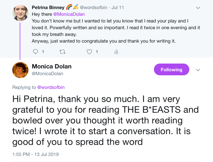 What I didn’t realise is how much it means even when people do know who you are. I love this reply, not only because it was unexpected, but because I gave a kind word, Miss Dolan gave a kind word back, and all feels right with the world.