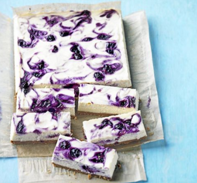 4. Pour half the cheesecake mixture over the biscuit base, then spoon half the blueberry sauce on top in small blobs. Cover with the remaining cheesecake mix and smooth the surface with a spatula. Drizzle the remaining blueberry sauce over the top, then use the end of the spoon to ripple it into the cheesecake. Bake for ten minutes, then lower the heat to 110°C and bake for a further thirty minutes. Turn off the oven and leave the cheesecake inside for one hour, then leave for a further hour, still inside the oven, but with the door ajar. Finally, leave at room temperature until completely cool, then chill for at least three hours or, ideally, overnight.