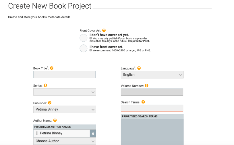 Book Title: Enter the title as it will appear on the cover. When entered, the final page of this set-up will give you the option to download the pdf. In the pdf, you’ll see that your title is printed on one page, your author name is printed on the reverse. It’s pretty nifty.
