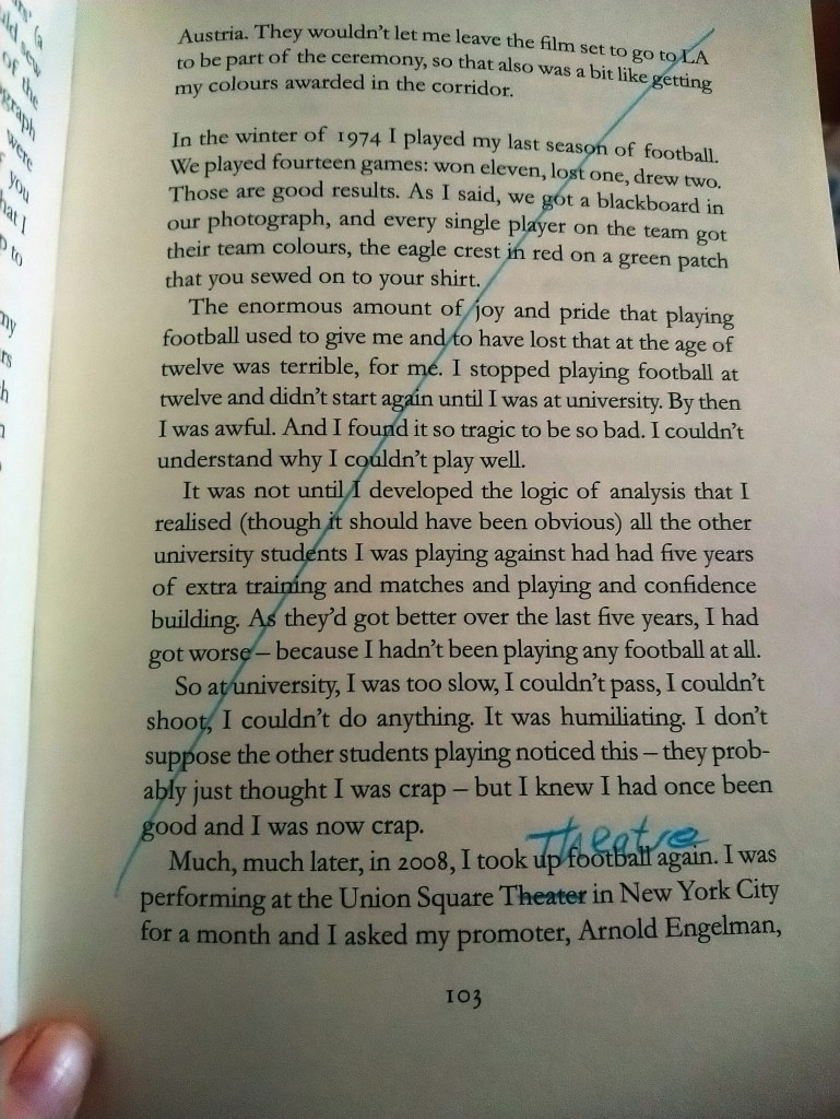 With regard to the entire pages that were struck through by the previous reader, those had to do with football. I’m guessing – not a fan. Although the notes from the former owner were banal and unnecessary, they didn’t detract from this wonderful autobiography. If anything, the corrections put me in mind of seeing an old friend at a party – not a rave, something ritzy with canapés and an occasional velouté – and the whole time the friend is trying to talk to you, the partner, who has only ever existed as a name in a Christmas card, jumps in to make mewling noises and add tiny details that nobody cares about. Which I suppose means that, though we’ve never met, I think of Suzy Eddie Izzard as a friend.